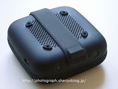 底部はシリコンラバーになっていて衝撃からも保護してくれる役割も担っている。ベルト部分の片方が取り外すことができ、ベルトや自転車などのサドルなどに通してスピーカーを固定できるようになっている。